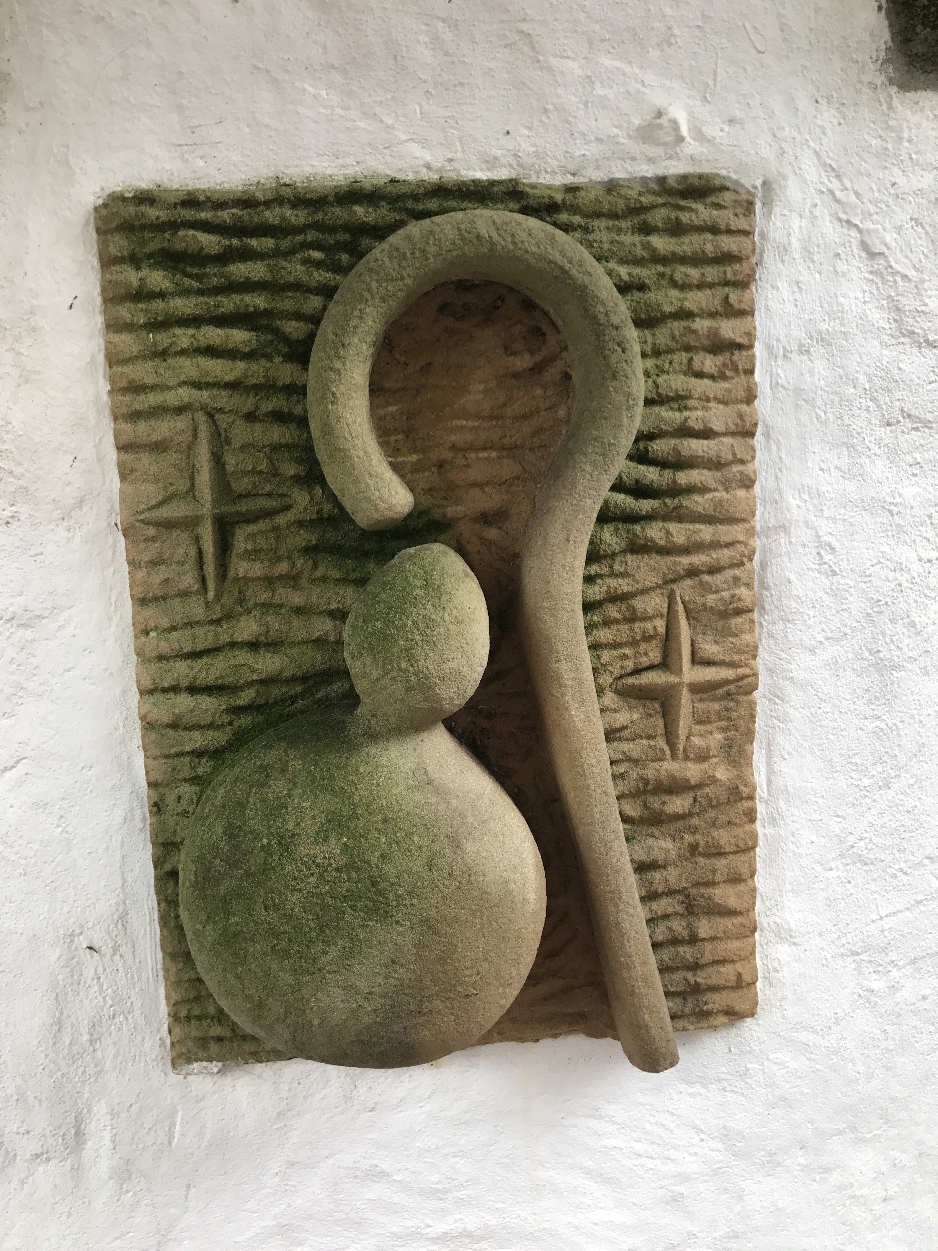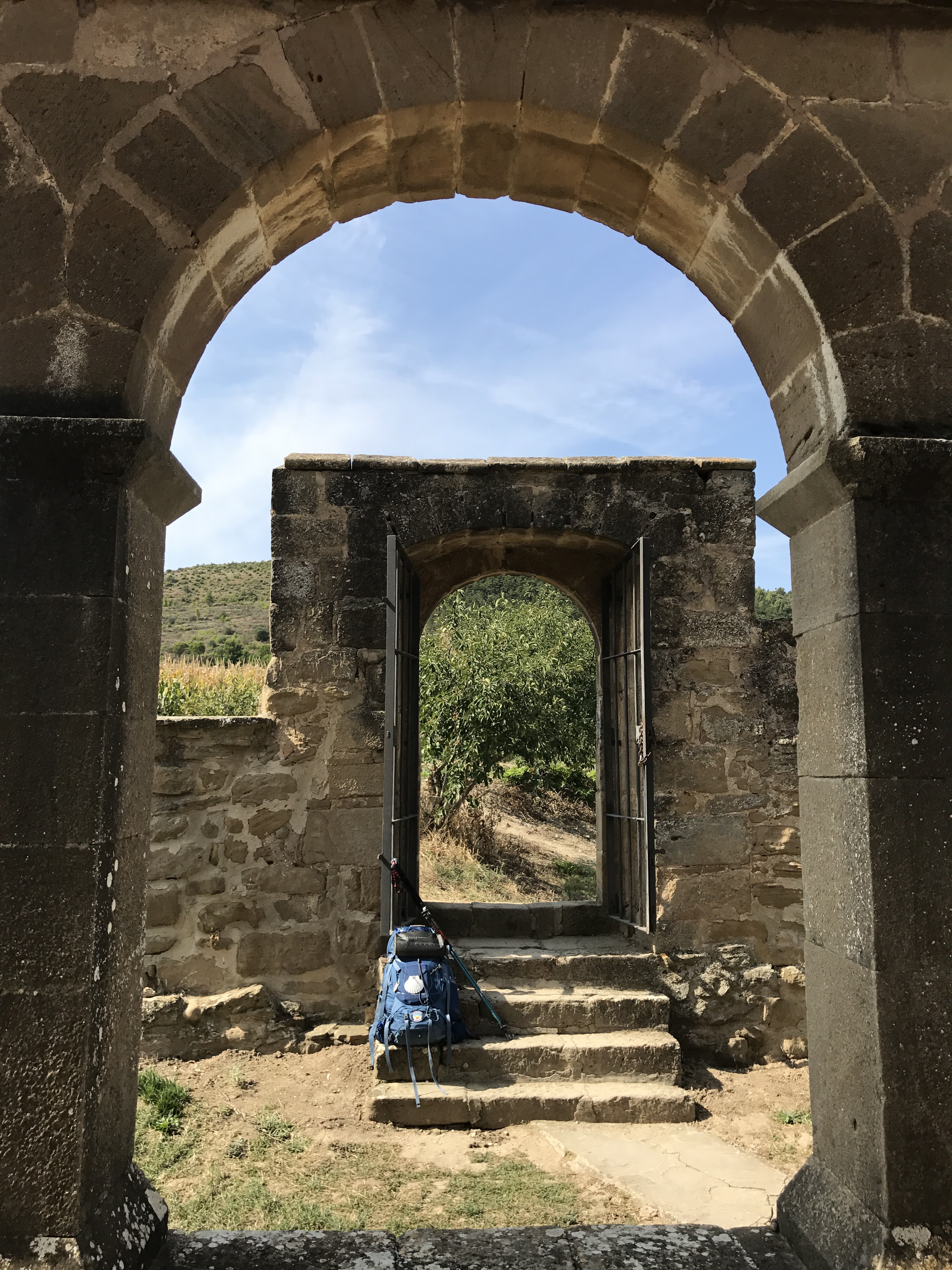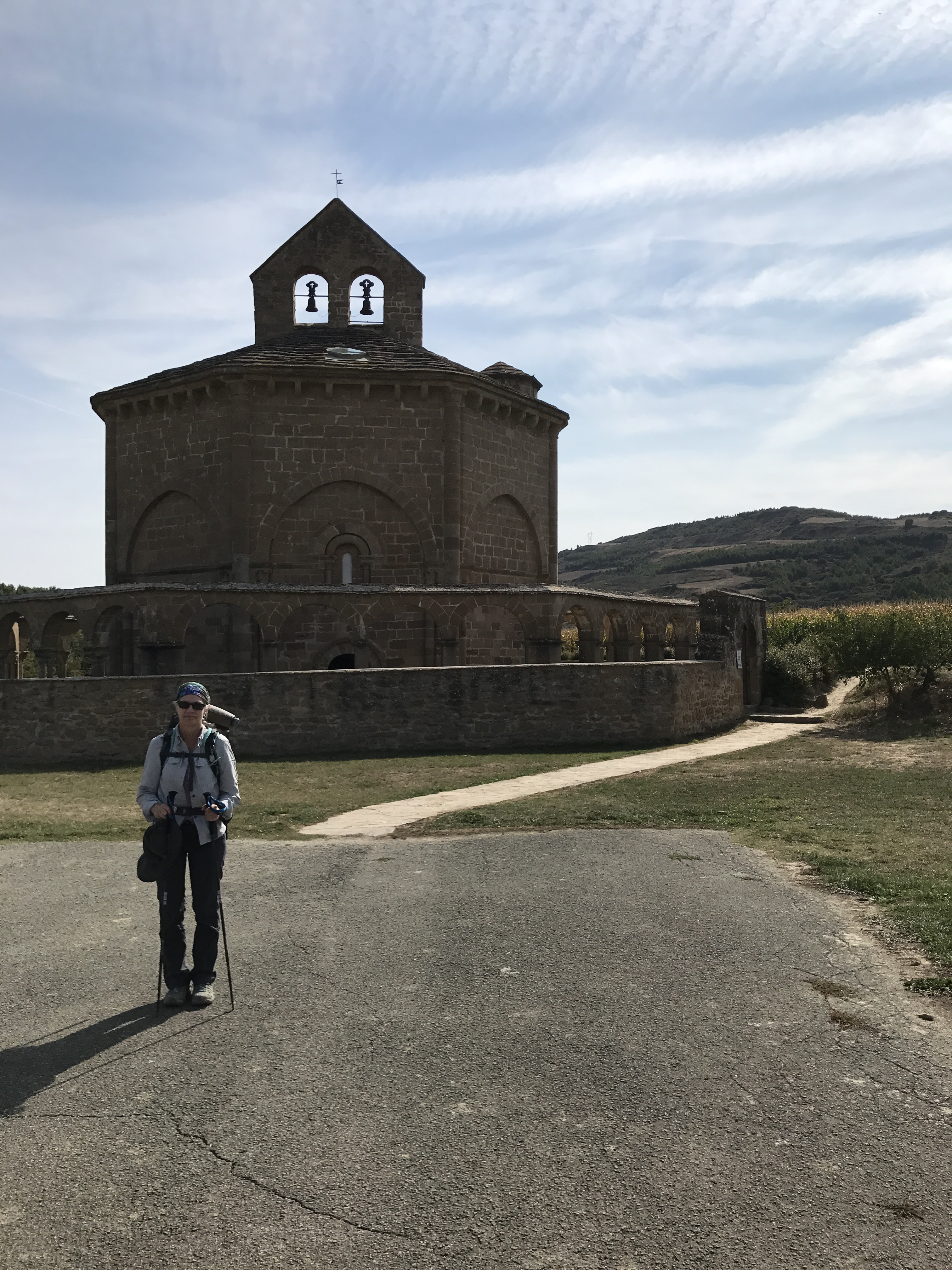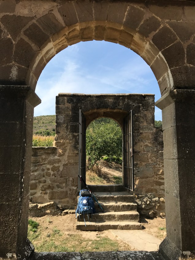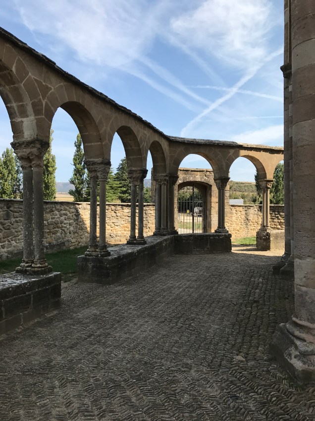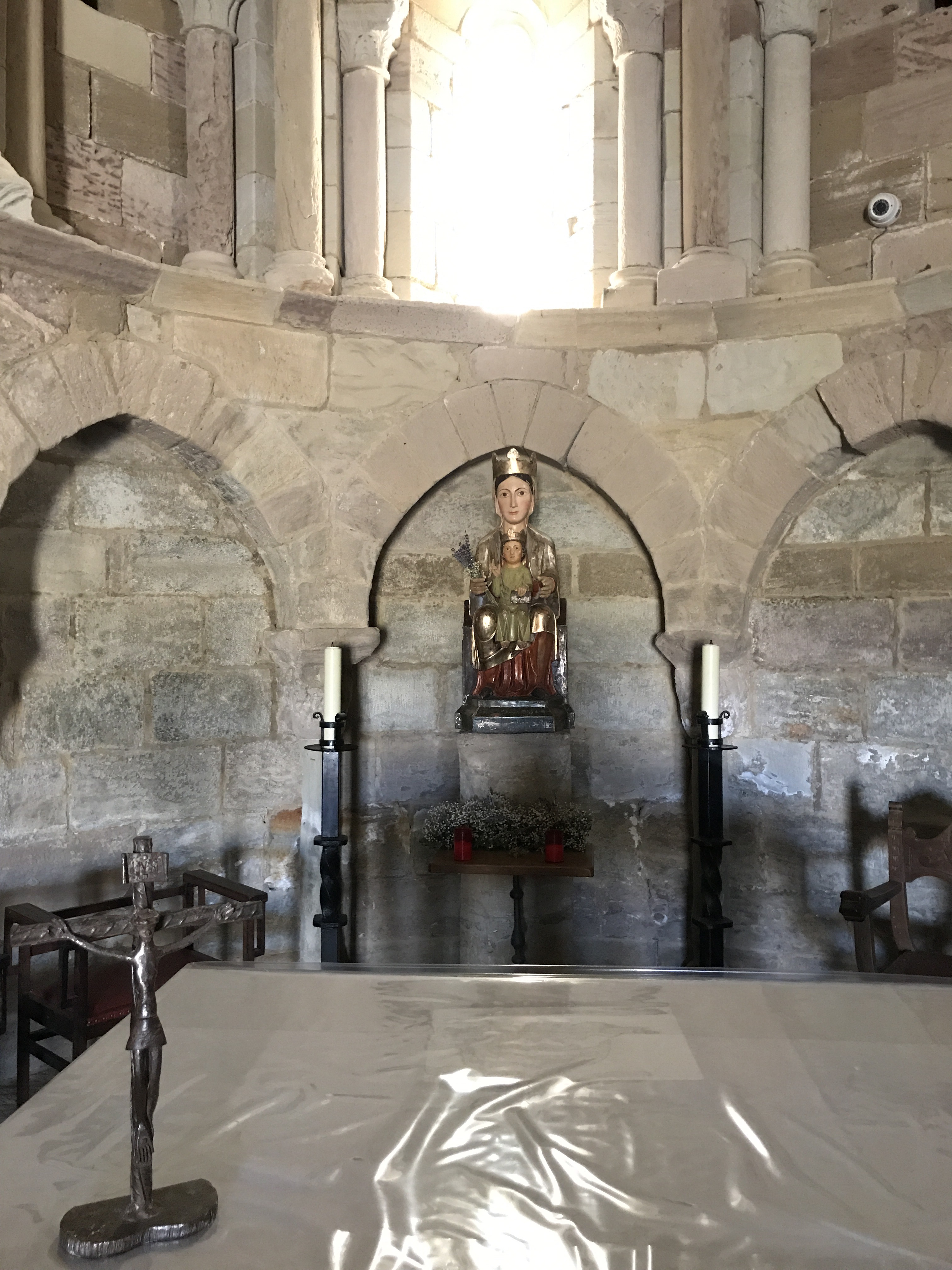 The path then became to meander through corn fields. We took a one mile detour to visit the mysterious Ermita de Santa Maria de Eunate. It is a 13th century octagonal shaped church with 33 arches surrounding it. The mystery is its origins…nobody quite knows who built it. Some say it was built by the Templars. Others believe the 33 arches represent Muslim prayer beads and suggest worshippers circled the church meditating three times (99 doors) before entering the 100th door of the church. Inside the church sits a statue of Mary.