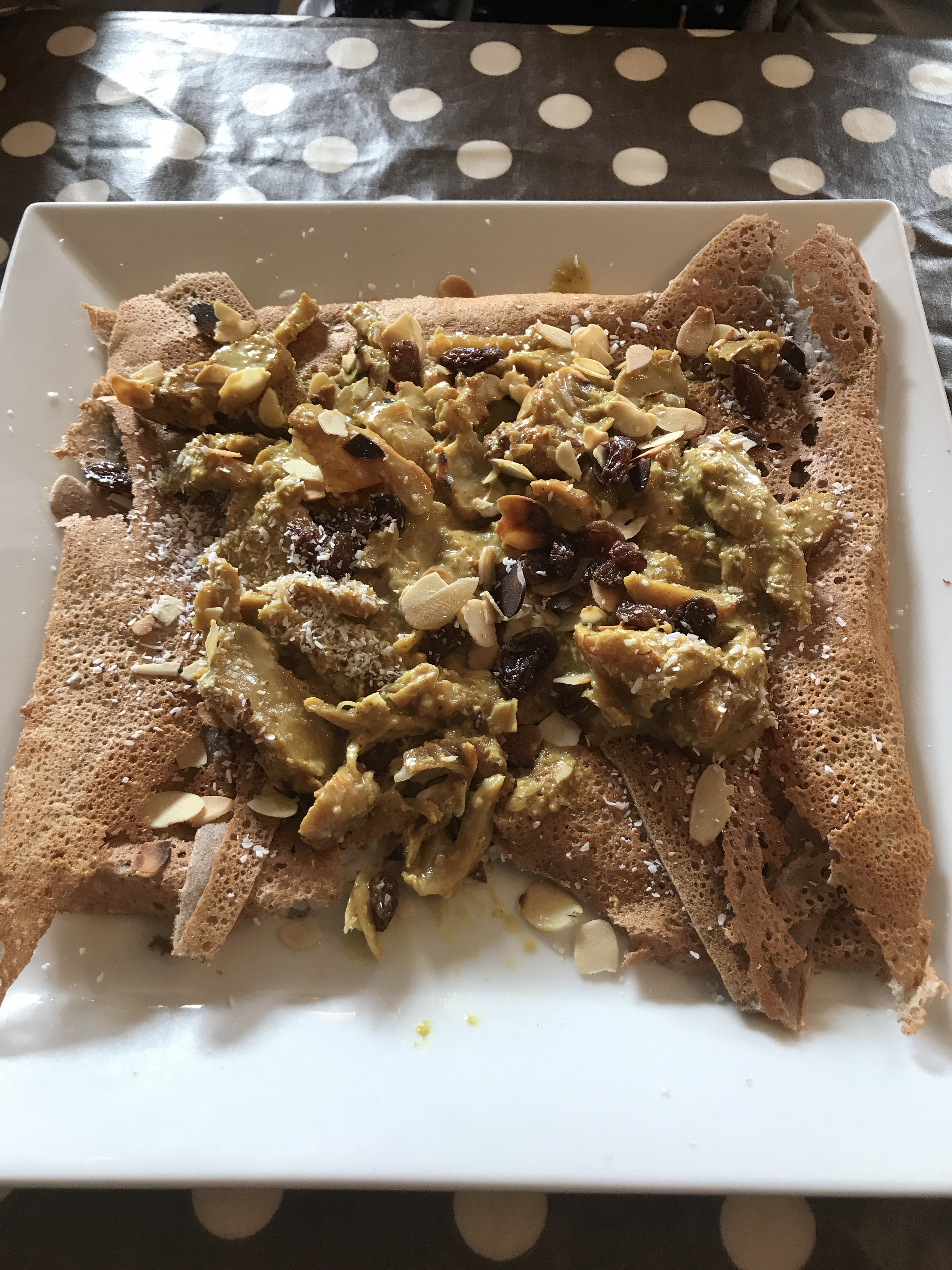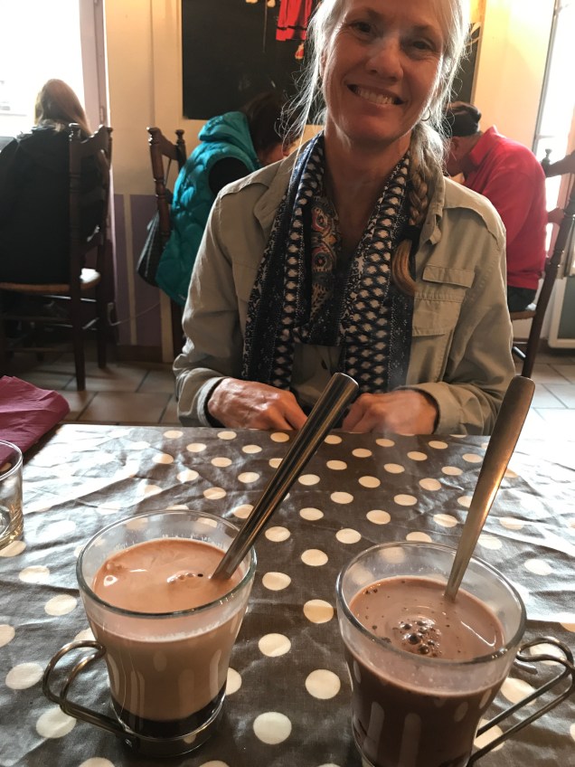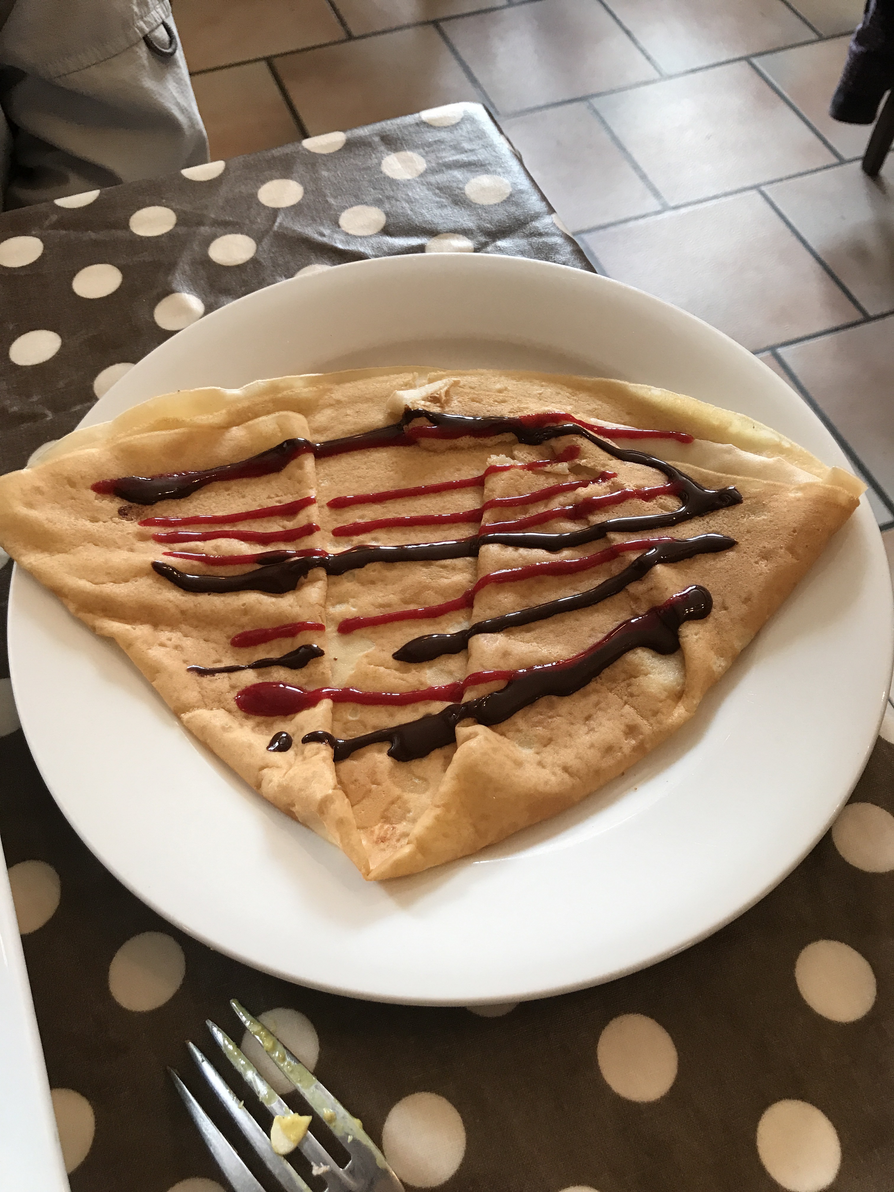 For lunch, Laura and I indulged in crepes – one savory and another sweet. The savory crepe was filled with rice and covered in curry chicken and raisins. The sweet crepe was chocolate and raspberry. Decadent hot chocolate completed the meal.