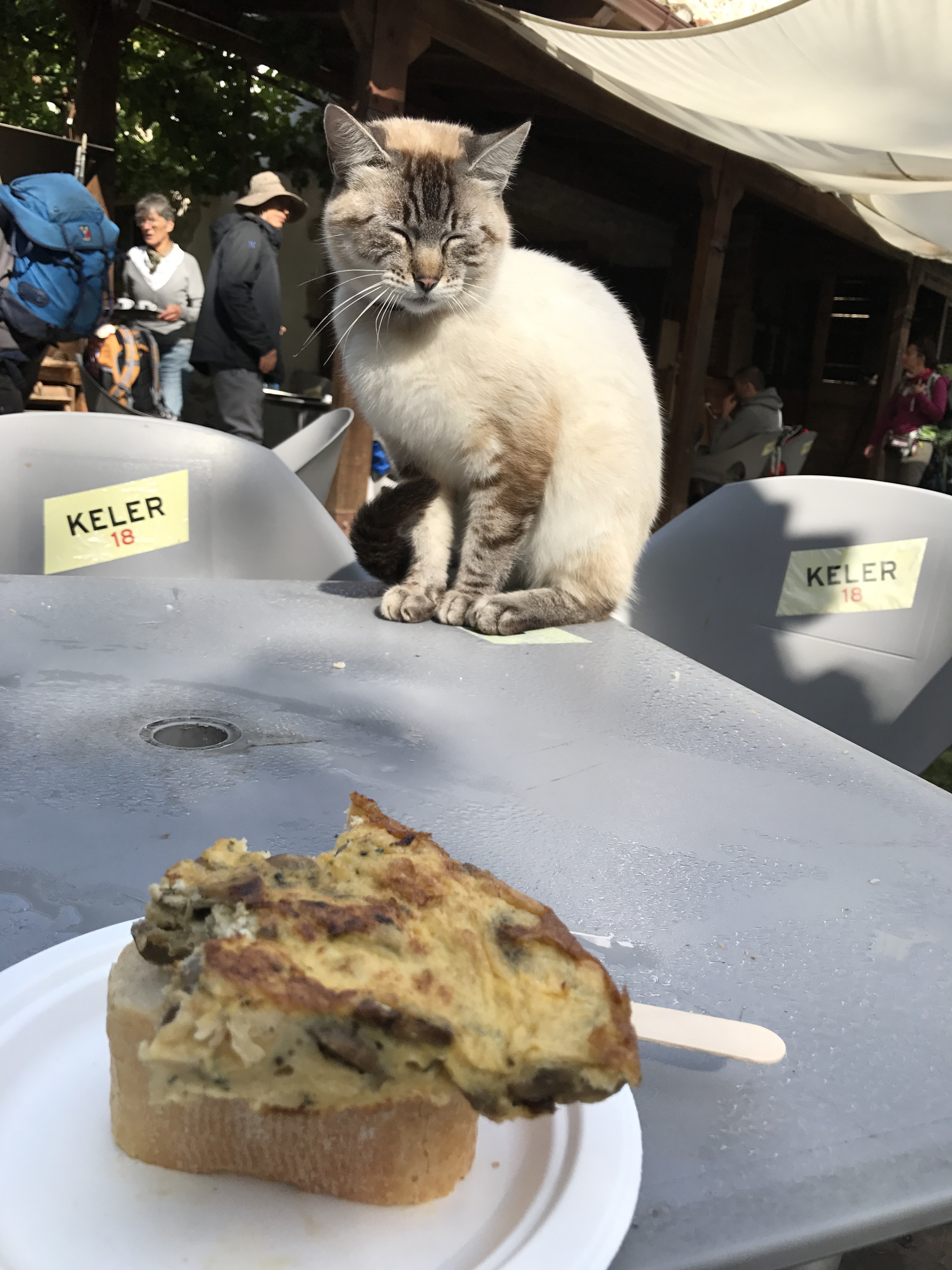 We stopped at one small town for a coffee and omelette. While enjoying our quick meal, a cat jumped up on the table. I was holding my omelette up to bite (the Spanish omelettes are dense and handheld) and the cat took a swipe at my omelette! Chickens also milled about under the tables as we ate.