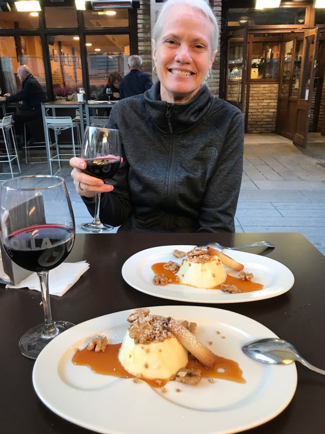 A hike we anticipated taking 6 hours ended up taking 8 hours. We were so happy to see our albergue. It was a newer one with a small number of beds. Many guests were pilgrims we already knew and it was nice to see them again. Dinner was amazing. The albergue owner’s wife made a kind of polenta cake, a delicious soup, salad and lemon flavored condensed milk dessert with green tomato jam on top. And of course, Spanish wine flowed from the flasks on the table.