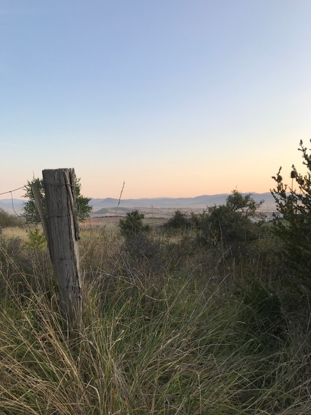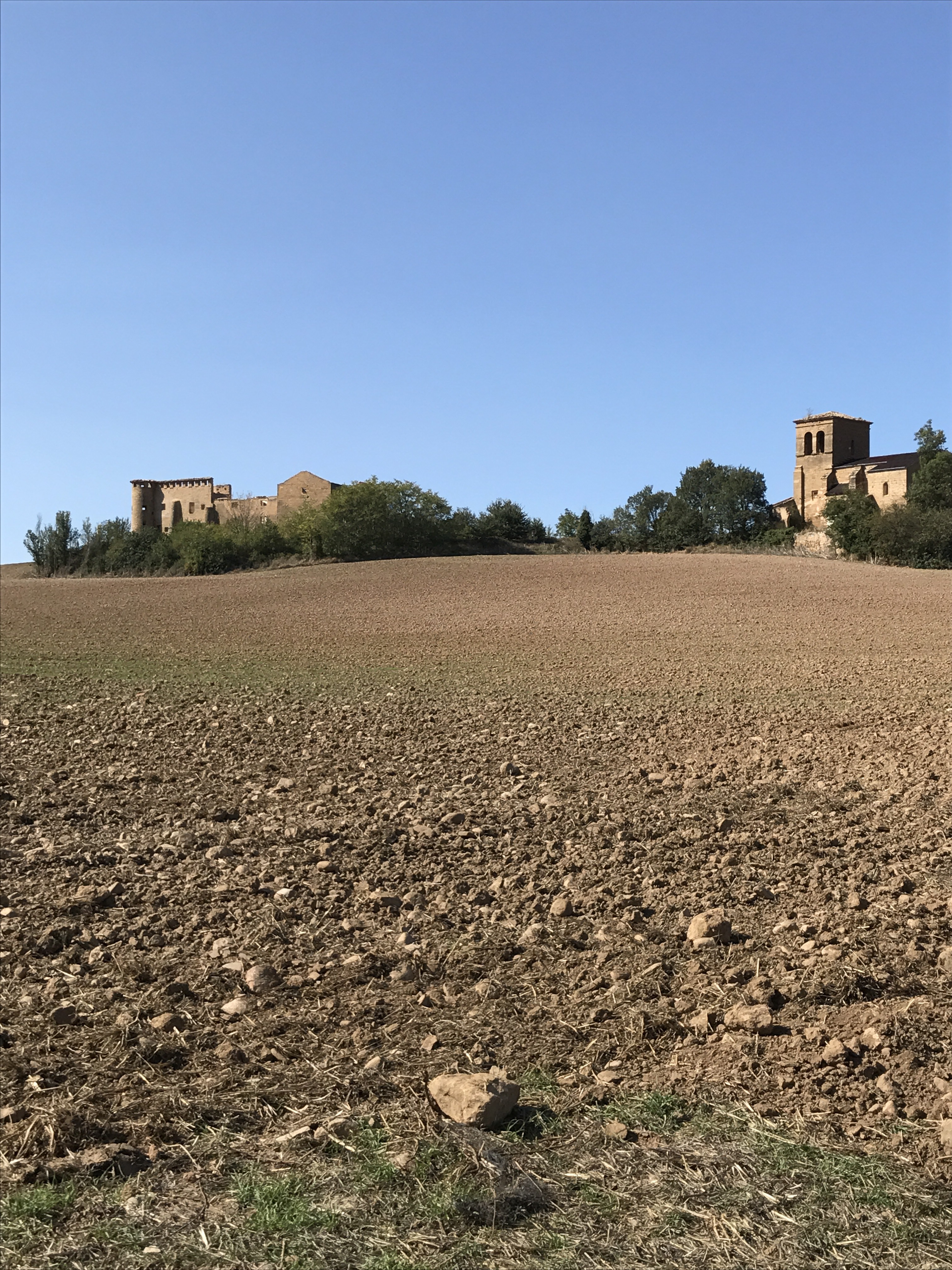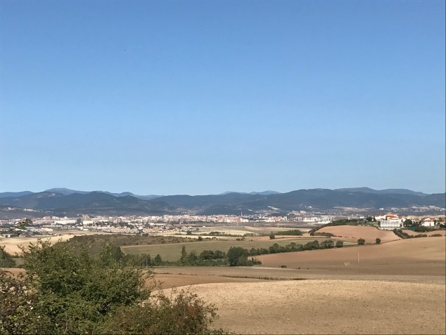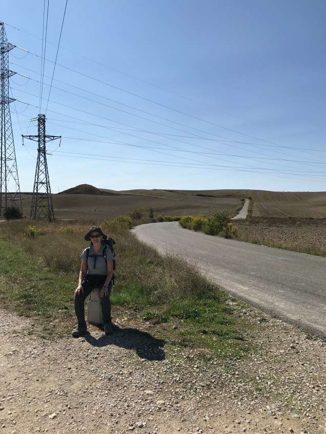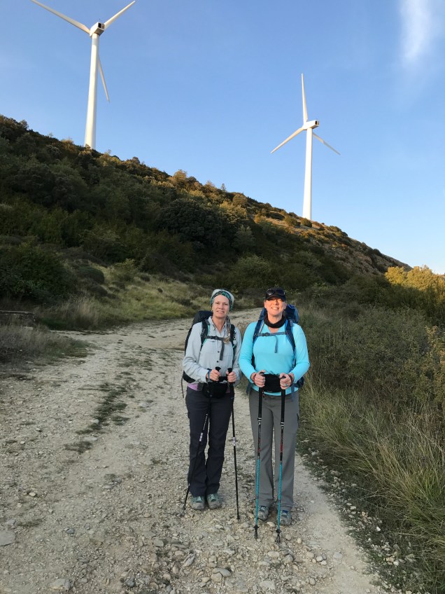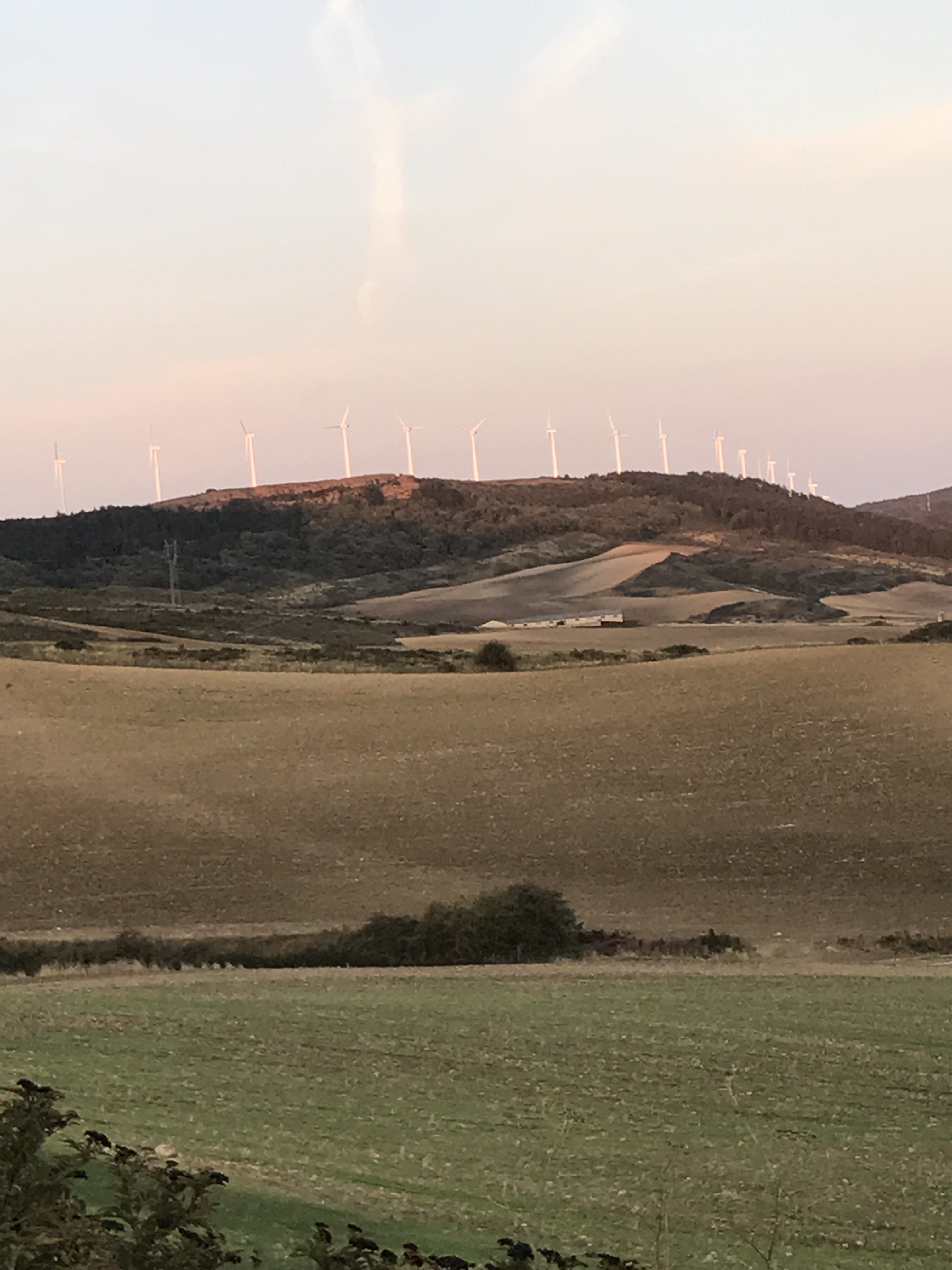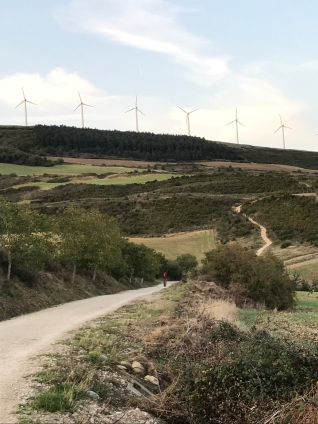 Pamplona was a lovely city. It had a modern feel, but lots of history. I would really like to come back sometime and explore more. As we hiked out of the city, there was a stark contrast to previous terrain. Gone were the shade trees, greenery and rivers. The land was brown, rocky and fallow. Silhouettes of giant windmills stood out in the distance. The sun baked our skin. There was a slight elevation climb.