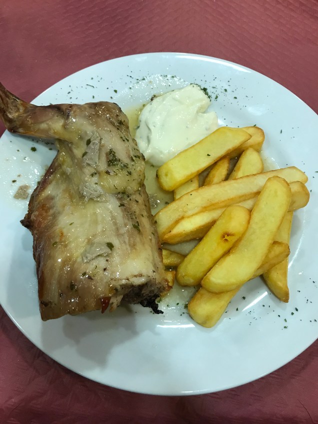 After getting our room, we had dinner at a local restaurant. If the albergue doesn’t serve dinner, most restaurants offer a pilgrims menu. I selected mixed paella (rice with pork, mussels and shrimp), roasted rabbit with aeoli and fries. They serve fries with everything here, at least on the pilgrims menu. Dessert and water or wine is included all for $10 total. Breakfast and lunch average $5 each. Then you have snacks, cafe con leche and laundry. Overall, I’m finding that it was reasonable to budget $40 per day for this adventure.