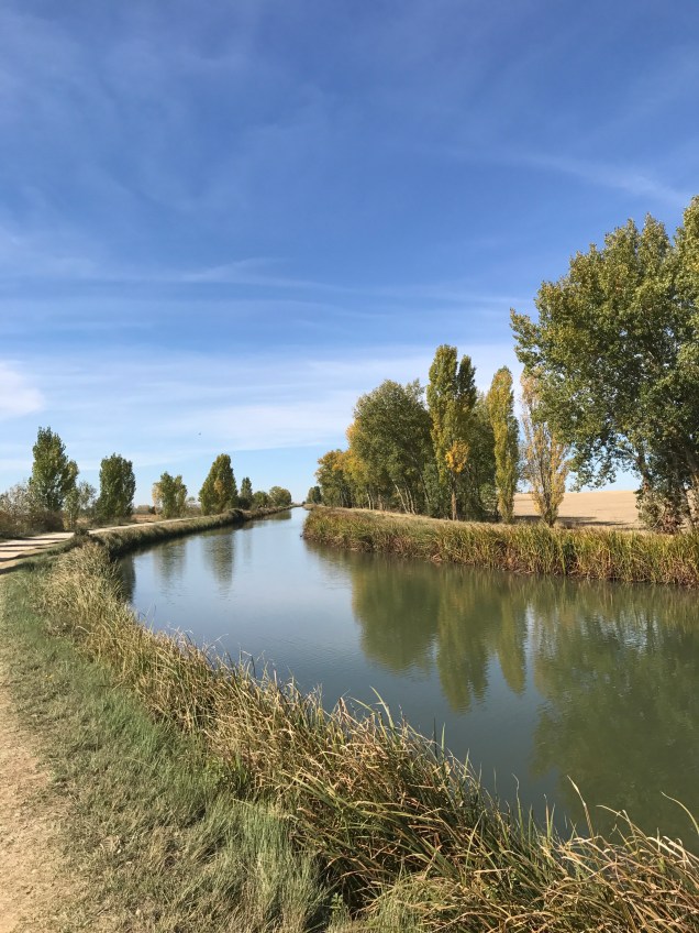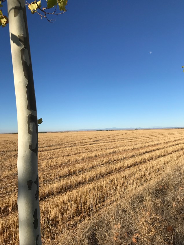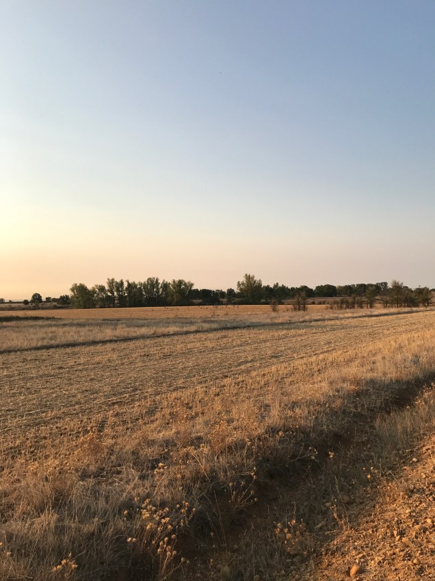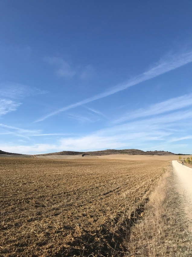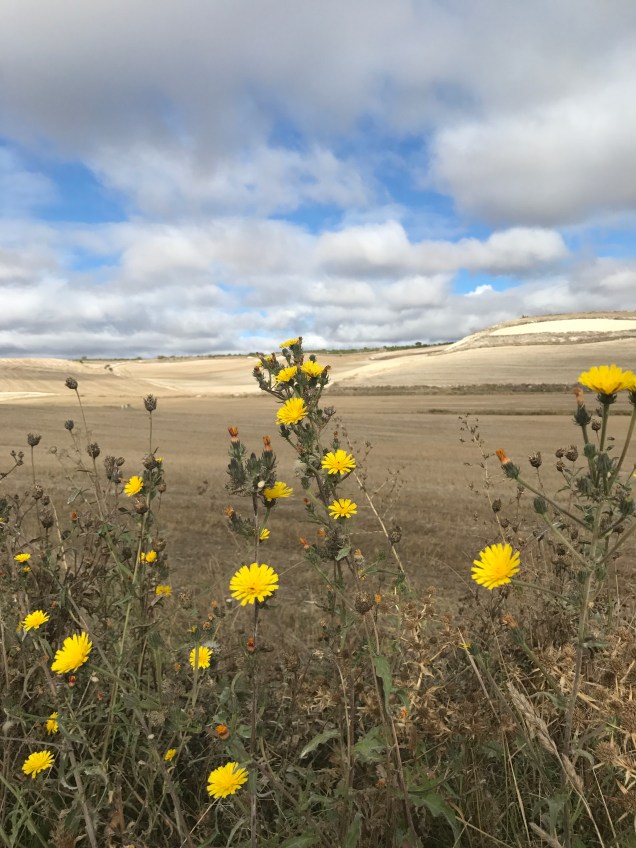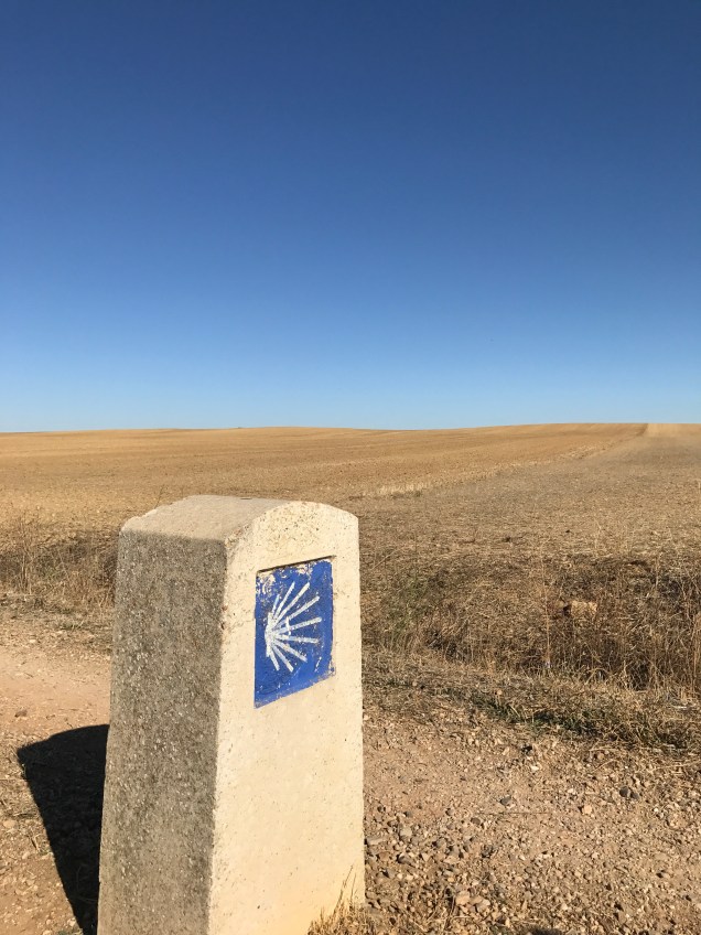 As soon as we begin walking, I feel the funk I’ve been in for the last few days lift. I don’t know whether it was the rest day in Leòn, being out in nature or just time, but I feel good. My spirits lift as we walk through a beautiful field full of birds. I see a flock of birds in flight tilt in unison and the underside of their bellies are a waving sea of deep blue. Another bird, black with white wings, dashes from bush to bush.